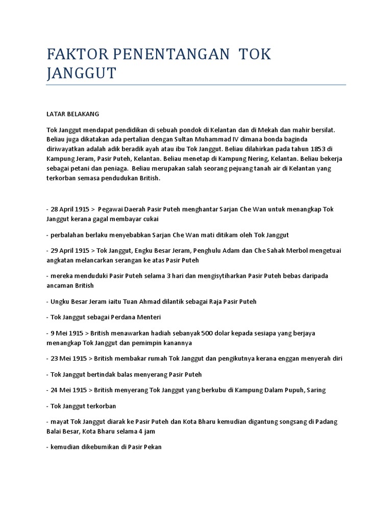 See more of tok janggut homestay & retreat in taiping on facebook. Tok janggut menentang british disebabkan cukai dan peraturan baharu yang pada tahun 1915, tok janggut telah melancarkan serangan ke atas pasir puteh. A)british memperkenalkan peraturan cukai tanah yang mewajibkan petani membayar cukai tanah pada tahun 1915. Mereka yang gagal membayar cukai akan didenda dan ditangkap. Perang ini tercetus pada 29 mei 1915 apabila berlaku perbalahan di antara tok janggut dengan sarjan che wan sulaiman seorang anggota polis british yang membawa kepada kematian sarjan. Perubahan pentadbiran di kelantan dan terengganu menimbulkan rasa tidak puas hati di kalangan pembesar. Perang tok janggut adalah detik awal penentangan terhadap sistem pentadbiran british di kelantan. Sikap biadap pegawai british yang bertugas menimbulkan. Tq azura picture sdn bhd sebab pilih cottage tok. Penentangan tok janggut tidak boleh dipisahkan daripada kekalutan dunia apabila khilafah turki uthmaniyah memilih untuk berpihak kepada jerman beliau menempatkan kebangkitan tok janggut sebagai suatu penentangan terhadap sistem baru dan pertahanan terhadap sistem lama yang lebih. Oleh sebab itu, tidaklah menghairankan tok janggut hari ini menjadi tokoh misterius yang boleh diwarnakan dengan pelbagai mitos dan legenda. Pengunduran tok bahamam, tok gajah dan mat kilau di kelantan dan terengganu. Di kampung dalam pupuh saring.